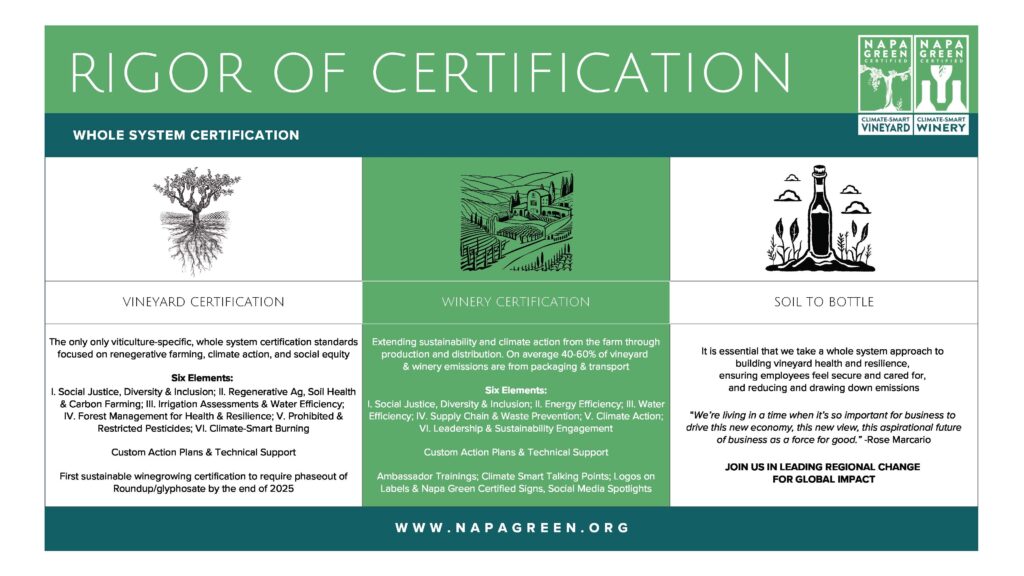 “Napa Green plays a vital, fundamental role in grape growing within and beyond the vineyard boundaries in Napa Valley,” said Michael Silacci. “The team, comprised of experts in all essential elements of farming and stewardship, provides education, guidance, and holds us accountable. Year after year they continue to evolve and challenge us to be better citizens. I want to do all I can to help Napa Green rise. Napa Green not only strengthens our community but also inspires a deeper sense of purpose – within ourselves, and in how we care for the land we love so dearly.”